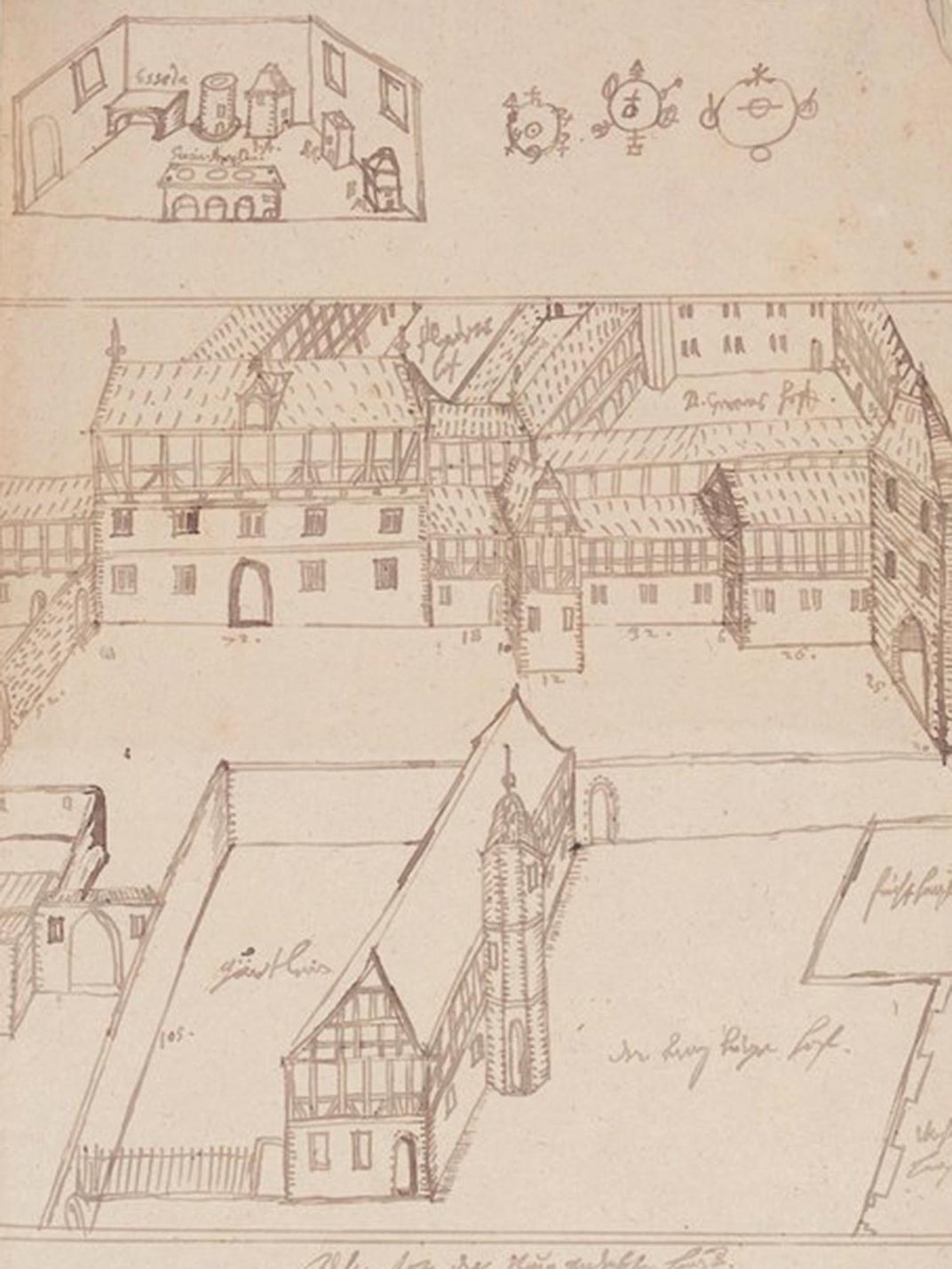 Die Hinterhäuser der Häuser Rothe Ochse, Zum Wolf und Falkenstein, in denen sich das Leben der Ugelheimer und Blum in der Fahrgasse abspielte.
