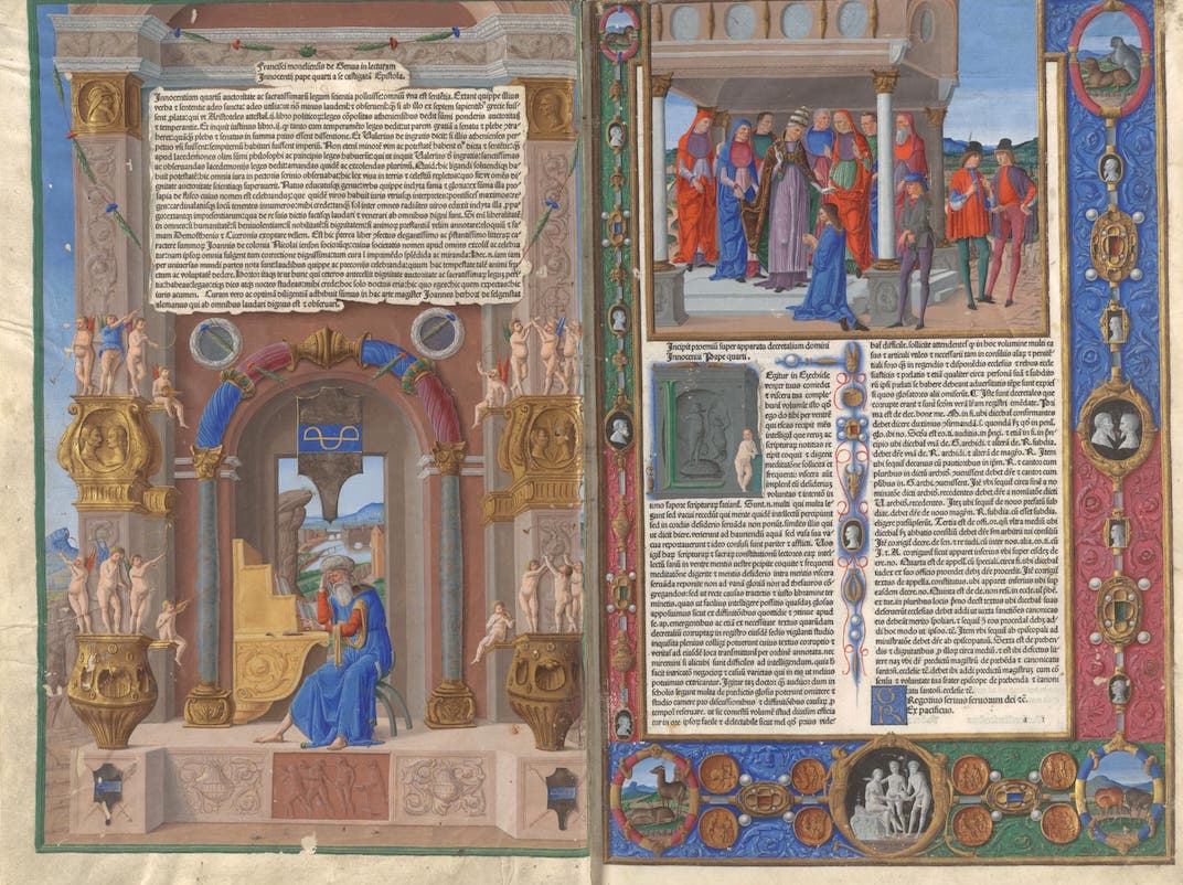 Ugelheimers Passion für Bücher beschränkte sich nicht auf die Produktion und auf den Handel. Ganzseitige Miniaturen, ausgeführt von den besten italienischen Buchmalern seiner Zeit, schmücken seine eigenen, auf Pergament gedruckten Inkunabeln. Wir blicken auf arkadische Landschaften, bewohnt von Tieren und Faunen, auf gedankenverlorene Philosophen, auf antike Architekturen, auf luxuriöse, illusionistisch gemalte Goldschmiedekunst. Die Einbände, aufs Feinste mit goldgeprägtem, durchbrochenem Leder verziert, imitierten orientalische Vorbilder. Und überall findet sich das Wappen des Frankfurters: die silberne Fessel auf blauem Grund. In seiner Sammlung spiegelt sich der Anspruch Ugelheimers: Niemand besaß zu seiner Zeit Besseres – Könige und Adlige nicht, auch nicht die Patrizier der reichen Handelsstädte. Für kurze Zeit – Ugelheimer stirbt schon 1488 – war er der stolze Besitzer der schönsten Bücher der Welt.